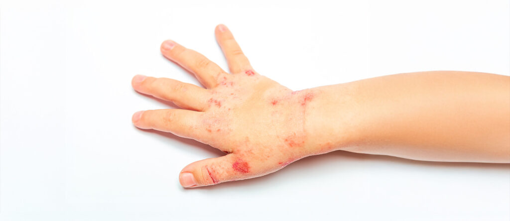 この細菌が、皮膚の表面にある小さな傷口や毛穴から体内に侵入することでとびひを発症します。特にお子さんは皮膚が薄いため、ちょっとしたことで皮膚をかき壊してしまい、とびひへと発展するケースも多いです。